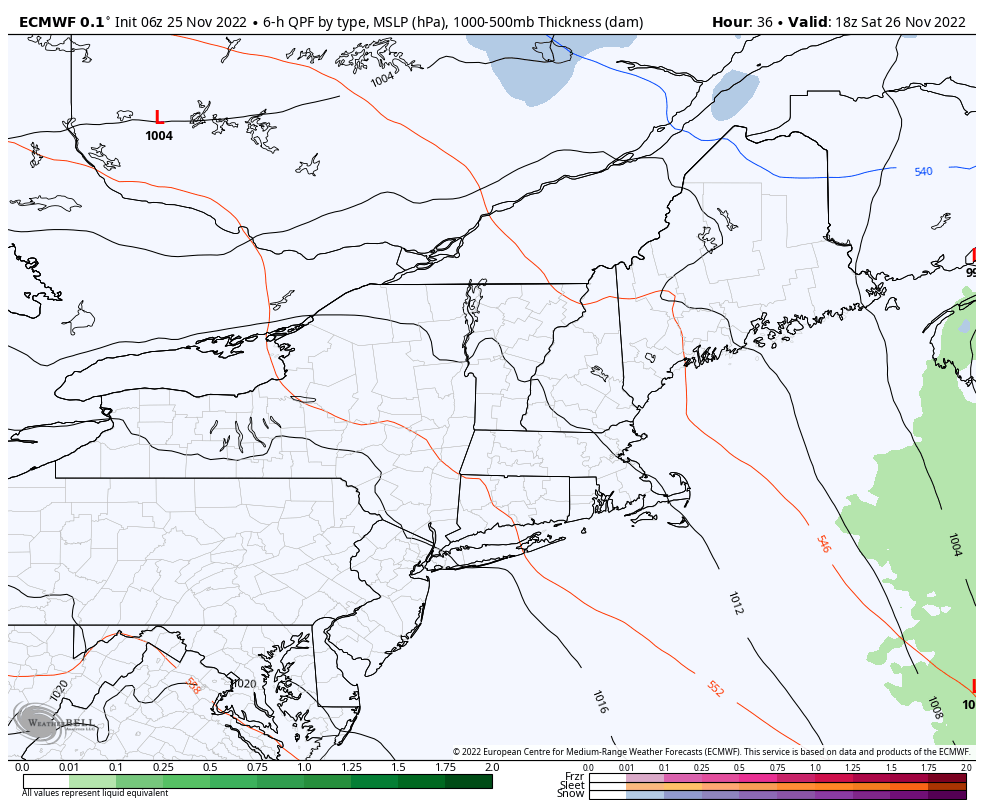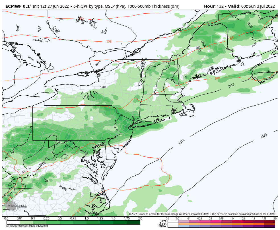 ECMWF model shows showers and thunderstorms with a cold front Saturday afternoon and evening in the Northeast.