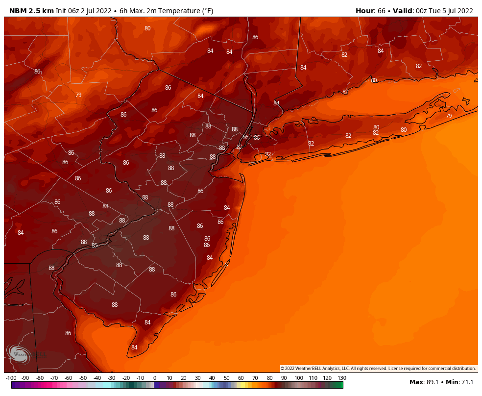 Independence day on Monday still looks like the best day of the holiday weekend. Expect plenty of sunshine and comfortable humidity all day. High temperatures will be in the mid-upper 80s again throughout New Jersey, Southeast NY, Southern Connecticut and Eastern PA. The weather shouldn’t have any impacts on outdoor plans or fireworks activities through the evening hours.