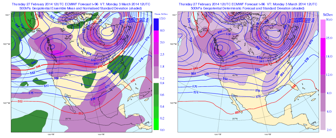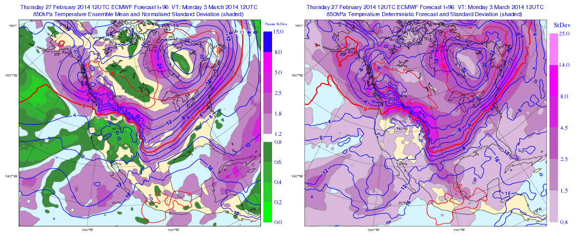 500mb heights and 850mb temperatures from today’s 12z ECMWF (right) and ECMWF Ensemble Mean (left):