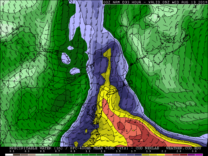Tonight and tomorrow morning, things get more interesting. The upper-level trough takes a negative-tilt and a secondary area of low pressure develops along the warm front. This will lead to stronger southeast flow, pumping a copious amount of moisture from the Atlantic into the tri-state area. Precipitate water values will increase to 2.00″ or higher. Lifting along warm front will be enhanced by two divergent upper-level jet streaks, a strengthening low-level jet and increasing convergence with secondary low acting as a triple-point. Elevated instability will be on the increase MUCAPES are forecast to be between 500 J/kg to 1000 J/kg, early tomorrow morning. This will result area of heavy rain and embedded thunderstorms moving across the area.