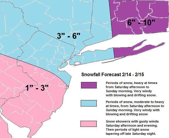 A polar shortwave at 500mb and clipper low at the surface will dive south towards the Northern Mid-Atlantic coast this weekend. Then close off at 500mb and rapidly intensifisy as it heads offshore. The snowfall forecast below is my guess how much snow will fall in general. How this forecast is not easy, as there several areas of lift on models on focusing of banding. Some of these band can produce heavier snowfall in some areas. While time same creating subsidence for other areas. So snowfall may seem to be as uniform as portrayed here. As storm explodes offshore, the pressure gradient with tighten and high winds become an issue. There is potential for damaging wind gusts over 60mph. Saturday night and Sunday morning. Stay tuned for more details and updates on this storm, as necessary tonight and tomorrow.